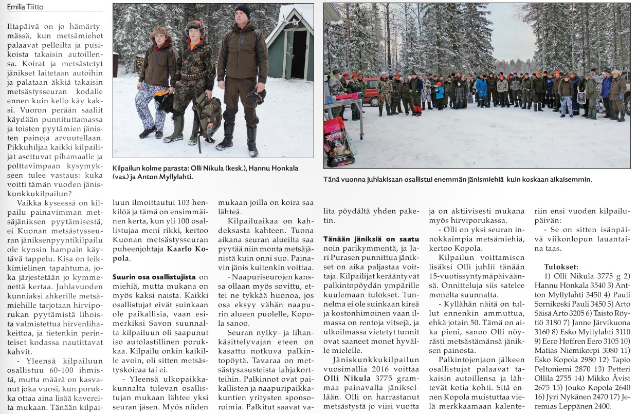 Maaselkä lehdessä oli 17.11. juttu Kuonan Metsästysseuran jäniskilpailuista. Juttu on luettavissa alla olevasta linkistä.